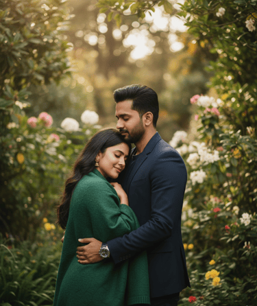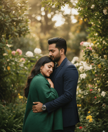 Create a warm, romantic outdoor photograph of a couple embracing in a lush, green garden with flowering plants in the background. The man has short, styled hair and a beard, wearing a fitted dark jacket and a watch. The woman, with long wavy hair, is wrapped in a textured green shawl, eyes closed and smiling gently as the man rests his forehead lovingly on her head. The atmosphere is cozy and intimate, with soft natural lighting filtering through the surrounding leaves and creating a dreamy, tranquil vibe. Pay close attention to their pose, clothing details, and the greenery-filled environment.