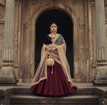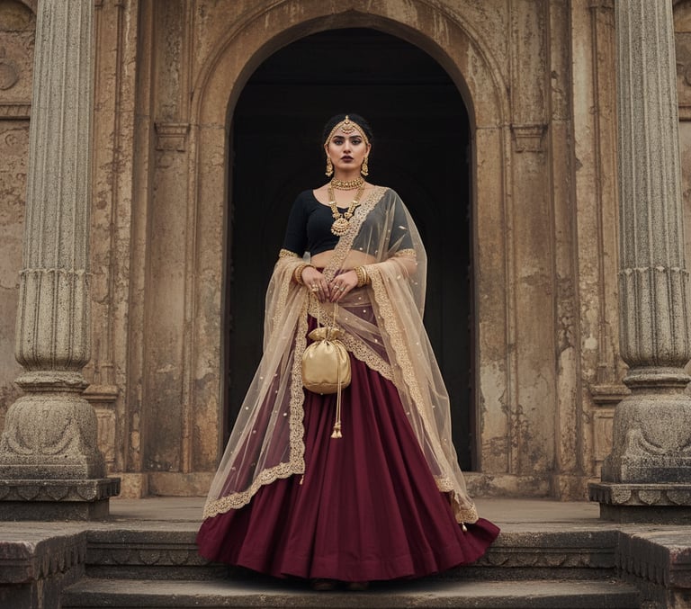 Prompt: Create a realistic portrait of a woman in the image to a stylish Indian woman standing confidently on ancient stone steps, framed by the weathered doorway of a grand, rustic building with arched columns and rich historical texture. She is wearing a traditional black blouse paired with a deep maroon flared lehenga skirt and a sheer beige dupatta with an intricate lace border. Her look is accented by gold temple jewelry including a maang tikka, necklace, earrings, and a vintage round golden potli bag. Her makeup is bold with dark lipstick, and her hair is neatly braided up. The overall lighting is soft and natural, highlighting the contrast between her vibrant clothing and the muted, earthy tones of the architectural setting. The mood should evoke timeless elegance, tradition, and architectural grandeur.