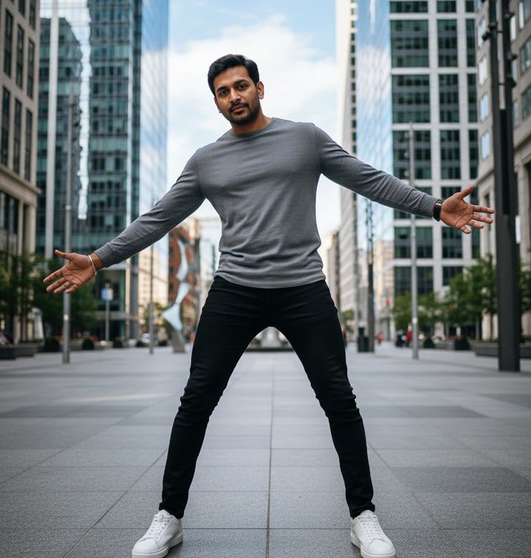 A creative photo, tall and well-built, stands in the middle of a modern urban area in an expressive pose. His feet are firmly planted on the gray granite floor, wearing white sneakers that stand out in the foreground. He wears black jeans, a grey long-sleeved shirt. Use the face from the uploaded reference image and preserve the same facial features - do not alter the face.