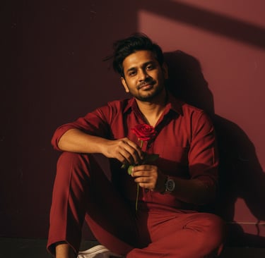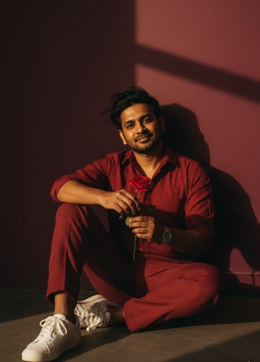 A full-body, camera look-angle portrait, He is sitting on the ground in a stylish pose against a solid deep wine-colored wall, with deep shadows creating an 90s movie and romantic, windy environment. He is wearing a perfect red wine-colored, retro aesthetic shirt with matching pants and white sneakers. He has a silver watch and is holding a single rose flower in hand — do not alter the face.