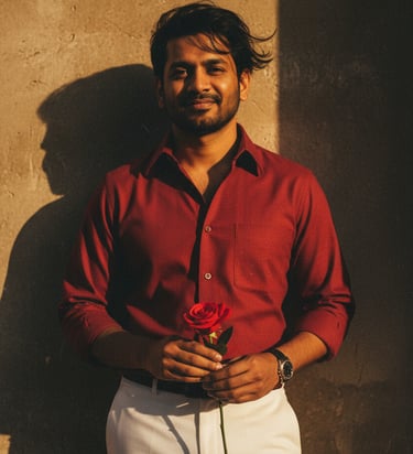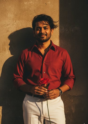 Create a retro vintage grainy but bright image of the reference picture but draped in a perfect red wine color Pinteresty aesthetic retro shirt with white pant and holding a rose flower in hands. It must feel like a 90s movie and romanticising windy environment. The boy is standing against a wall deep shadows and contrast drama, creating a mysterious and artistic atmosphere where the lighting is warm with a golden tones of evoking a sunset or golden hour glow. The expression on her face is moody, calm yet happy and introspective. Use the face from the uploaded reference image and preserve the same facial features — do not alter the face.