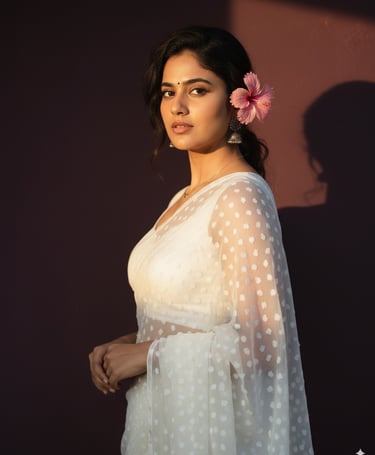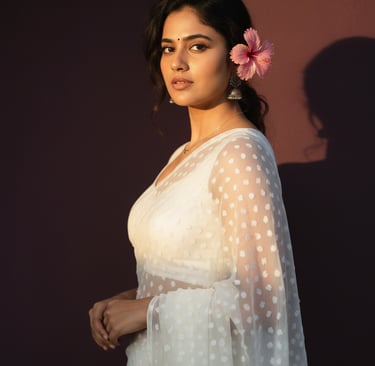 Prompt: Create a realistic portrait of a woman in a translucent white polka-dot saree with matching blouse. A soft pink flower is tucked behind her ear, and warm light from the side casts a cinematic shadow. She exudes vintage diva energy.